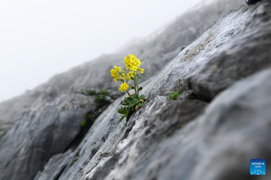 This photo taken on July 23, 2025 shows a Draba yunnanensis Franch. on Yulong Snow Mountain in Lijiang, southwest China's Yunnan Province. Known as "Plant Kingdom" in China, Yunnan nurtures a wealth of rare alpine plants thanks to its unique geographical position, diverse landforms and complex climatic conditions. (Photo by Zhao Qingzu/Xinhua)