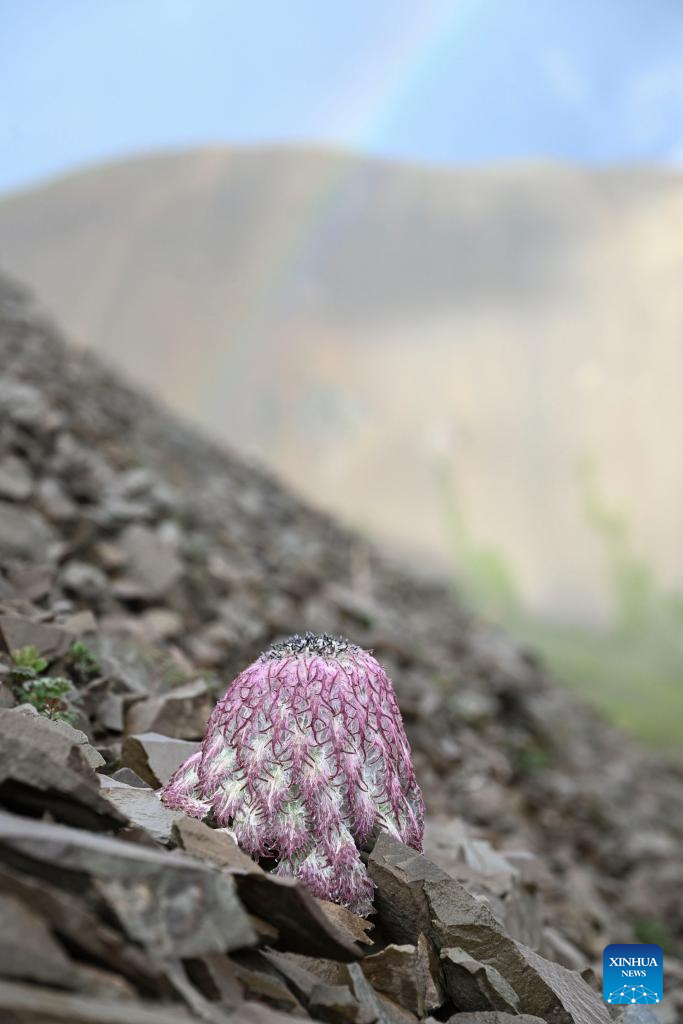 This photo taken on July 25, 2025 shows a Saussurea medusa Maxim. in Deqin County, the Deqen Tibetan Autonomous Prefecture, southwest China's Yunnan Province. Known as "Plant Kingdom" in China, Yunnan nurtures a wealth of rare alpine plants thanks to its unique geographical position, diverse landforms and complex climatic conditions. (Xinhua/Qin Qing)