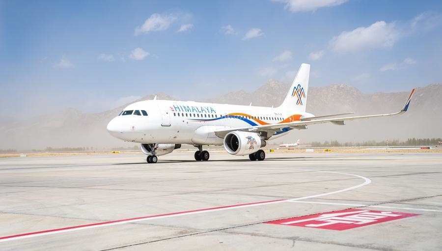 A maiden flight from Lhasa to Pokhara is seen at Lhasa Konggar International Airport in Lhasa, southwest China's Xizang Autonomous Region, March 31, 2025. (Xinhua/Tenzin Nyida)