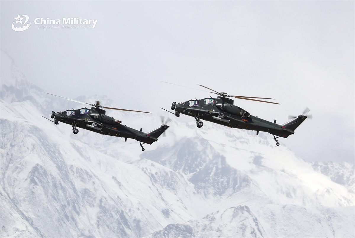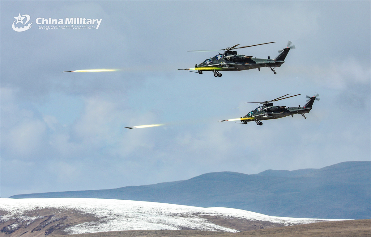 Z-10 attack helicopters attached to an army brigade under the Chinese PLA Xizang Military Command fire at the targets at ultra-low altitude during a training exercise in snow-covered plateau region in early January, 2026. (eng.chinamil.com.cn/Photo by Hu Qiwu)