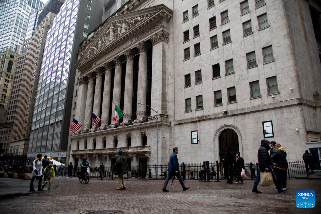 People walk past the New York Stock Exchange (NYSE) in New York, the United States, on March 13, 2023. U.S. stocks ended mixed on Monday. The Dow fell 0.28 percent to 31,819.14, and the S&P 500 decreased 0.15 percent to 3,855.76, while the Nasdaq was up 0.45 percent to 11,188.84. (Photo by Michael Nagle/Xinhua)