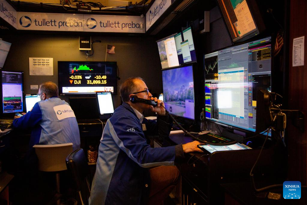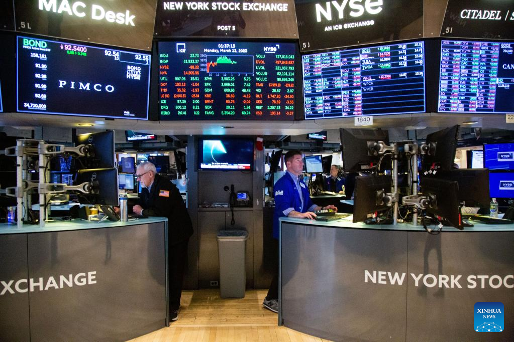 Traders work on the floor of the New York Stock Exchange (NYSE) in New York, the United States, on March 13, 2023. U.S. stocks ended mixed on Monday. The Dow fell 0.28 percent to 31,819.14, and the S&P 500 decreased 0.15 percent to 3,855.76, while the Nasdaq was up 0.45 percent to 11,188.84. (Photo by Michael Nagle/Xinhua)