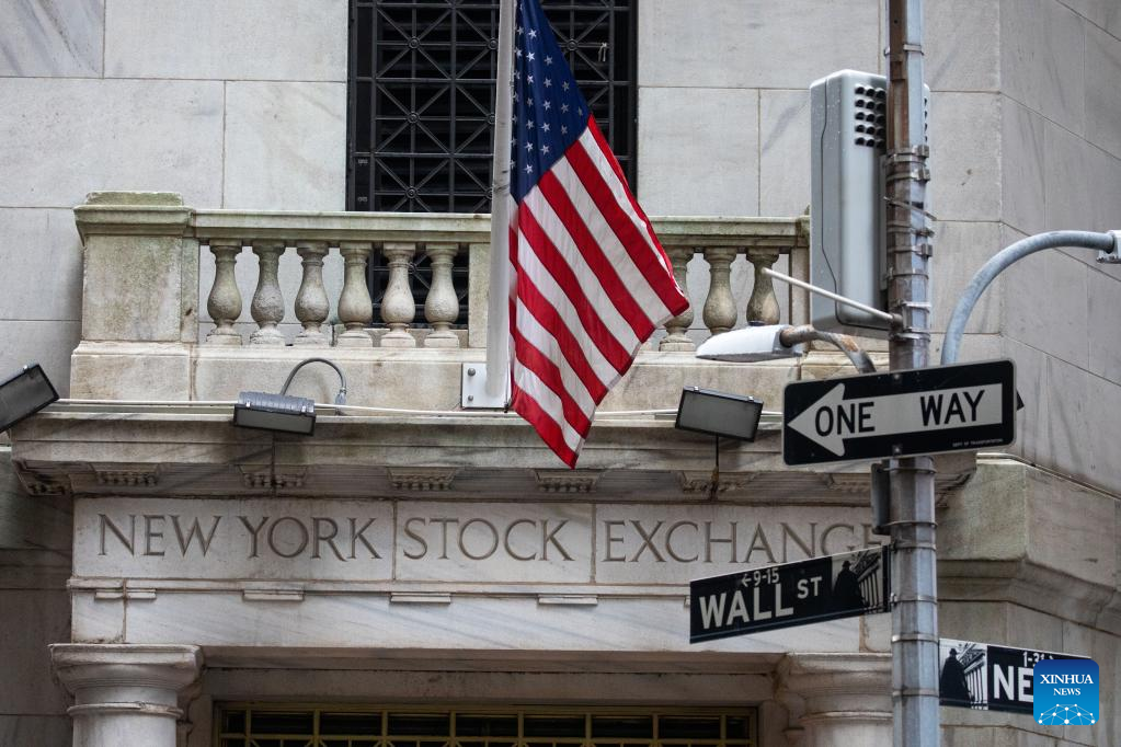 A Wall Street sign is seen in front of the New York Stock Exchange (NYSE) in New York, the United States, on March 13, 2023. U.S. stocks ended mixed on Monday. The Dow fell 0.28 percent to 31,819.14, and the S&P 500 decreased 0.15 percent to 3,855.76, while the Nasdaq was up 0.45 percent to 11,188.84. (Photo by Michael Nagle/Xinhua)