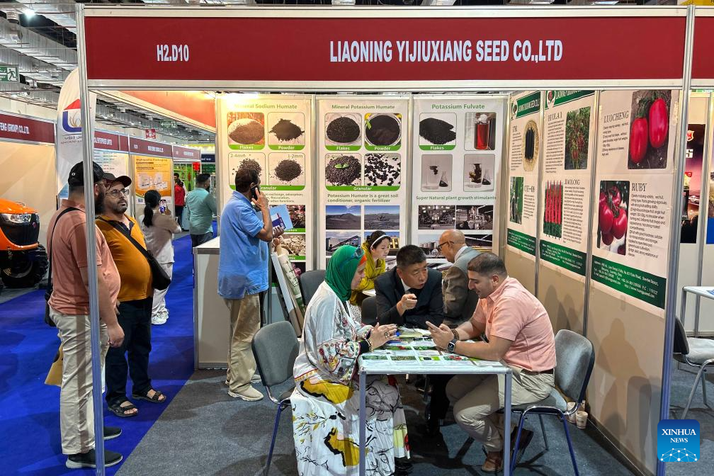 People visit a booth at the Chinese pavilion during the International Agricultural Exhibition for Africa and the Middle East in Cairo, Egypt, Sept. 12, 2023. Amidst the bustling aisles of Egypt's annual agriculture expo, the Chinese pavilion has attracted the attention of curious Egyptian visitors who are keen to explore the latest agricultural technologies from China.(Xinhua/Ahmed Gomaa)
