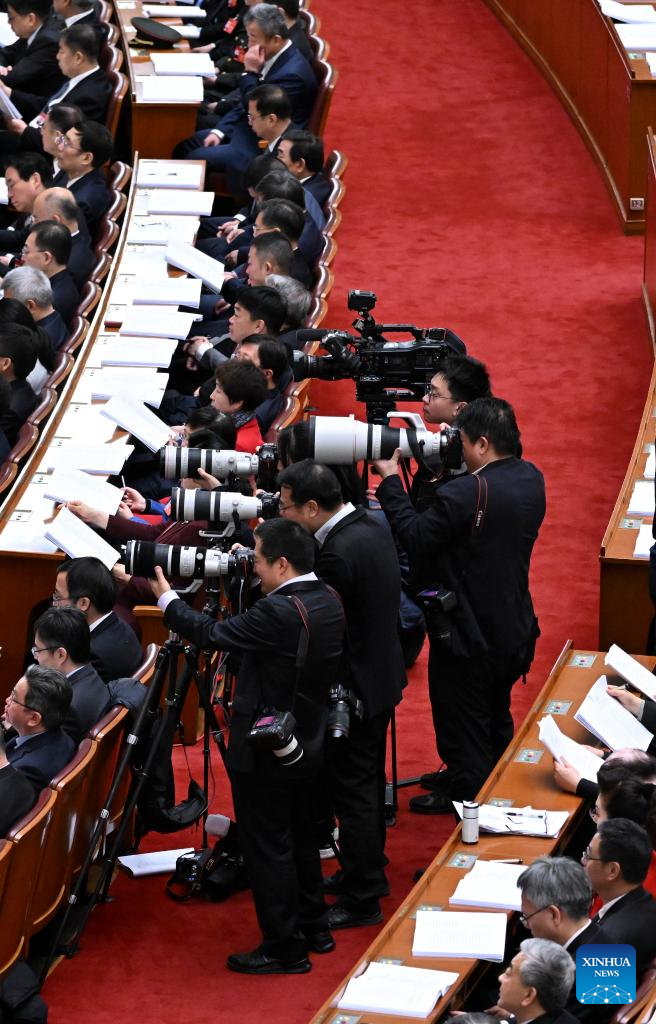 Journalists work at the third plenary meeting of the second session of the 14th National Committee of the Chinese People's Political Consultative Conference (CPPCC) at the Great Hall of the People in Beijing, capital of China, March 9, 2024. (Xinhua/Chen Yehua)