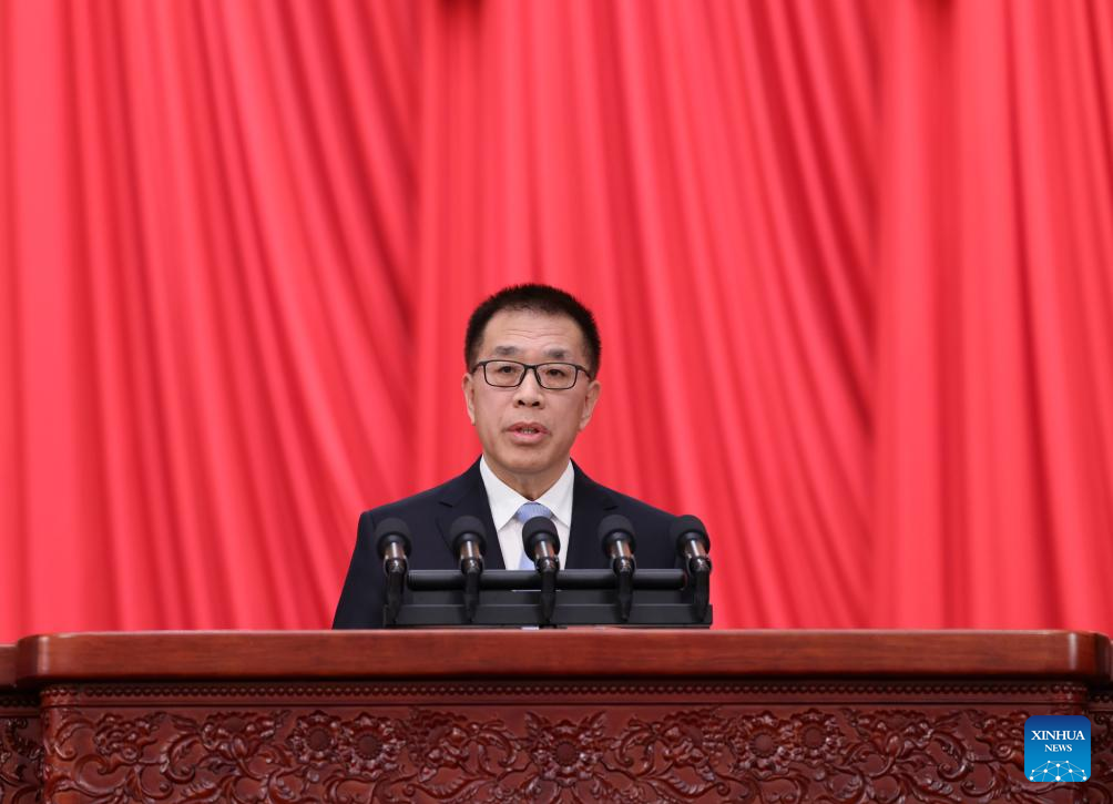 Leung Chun-ying presides over the third plenary meeting of the second session of the 14th National Committee of the Chinese People's Political Consultative Conference (CPPCC) at the Great Hall of the People in Beijing, capital of China, March 9, 2024. (Xinhua/Huang Jingwen)