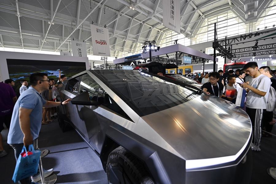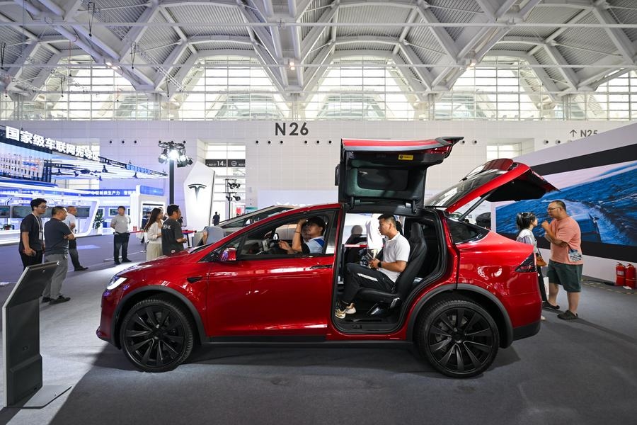 People visit the booth of Tesla at the World Intelligence Expo 2024 in north China's Tianjin, June 22, 2024. (Xinhua/Li Ran)