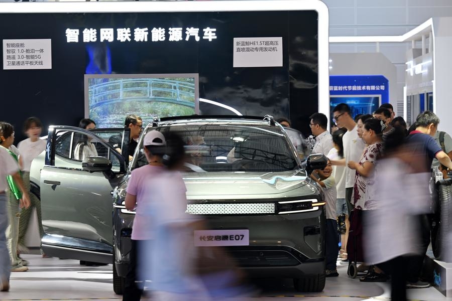 People visit the booth of Chang'an Auto at the World Intelligence Expo 2024 in north China's Tianjin, June 22, 2024. (Xinhua/Li Ran)