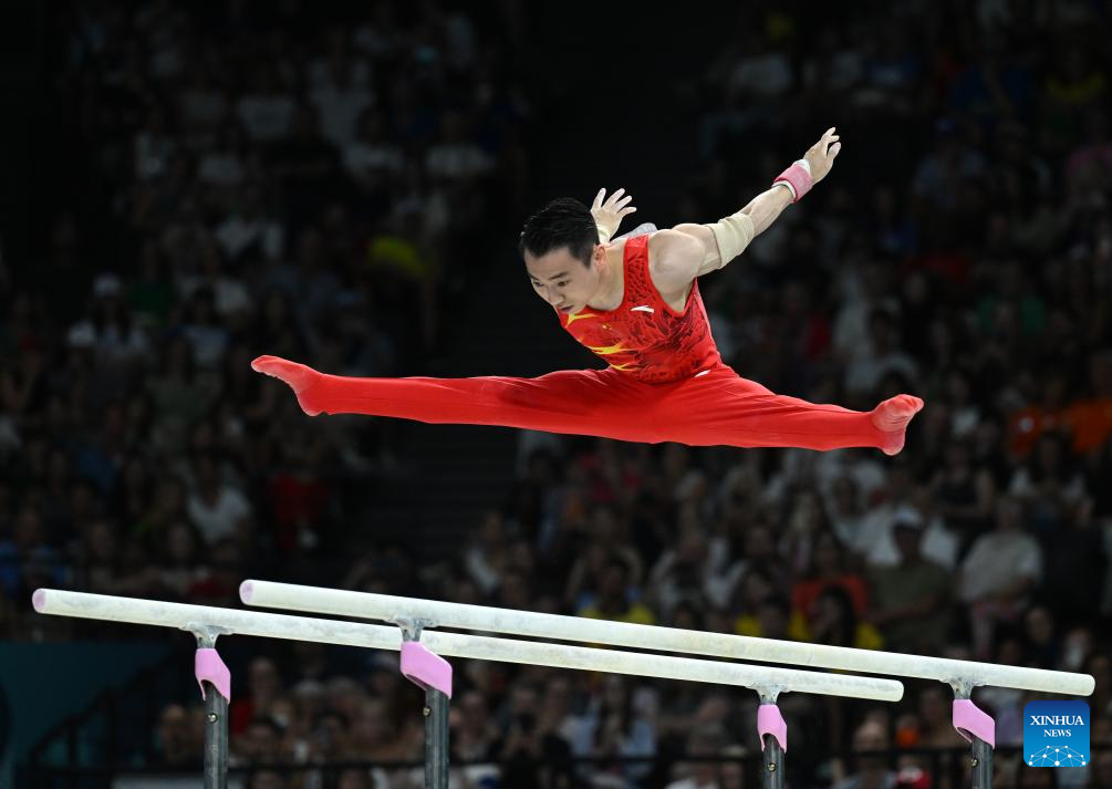 Zou Jingyuan of China competes during the men's parallel bars final of artistic gymnastics at the Paris 2024 Olympic Games in Paris, France, Aug. 5, 2024. (Xinhua/Lai Xiangdong)