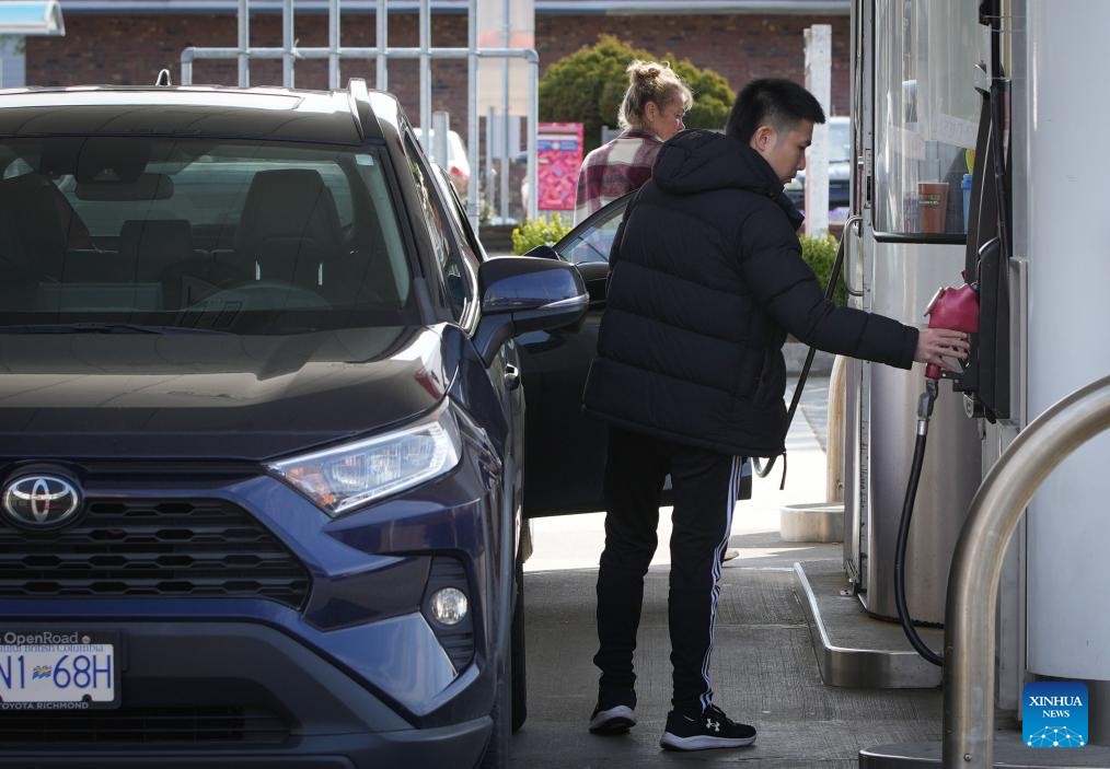 A man fuels a vehicle at a gas station in Vancouver, British Columbia, Canada, on April 15, 2025. Canada's Consumer Price Index (CPI) rose 2.3 percent year over year in March, following an increase of 2.6 percent in February, Statistic Canada said Tuesday. The year-over-year slowdown in the all-items CPI was driven by lower prices for travel tours and gasoline in March, said the national statistical agency. (Photo by Liang Sen/Xinhua)
