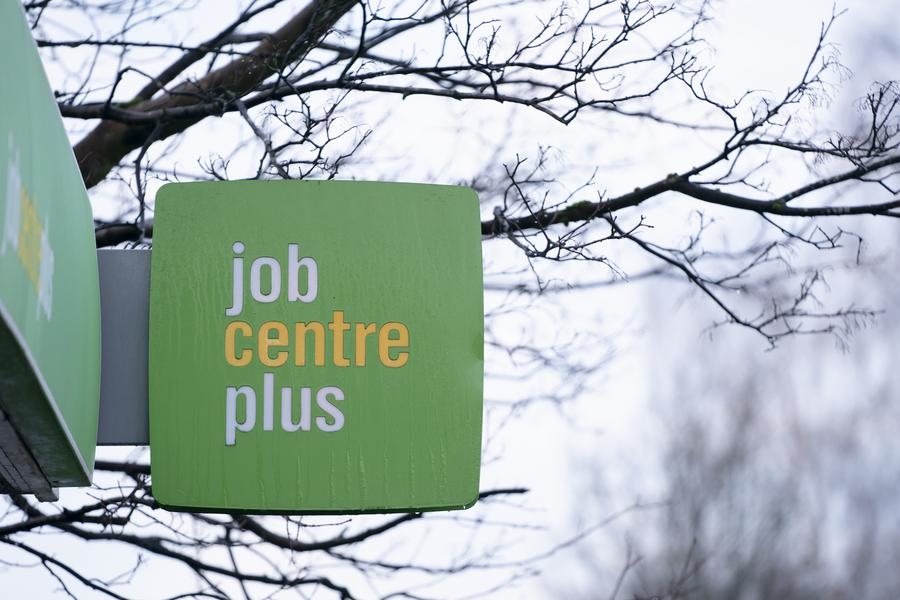 Photo taken on Jan. 18, 2022 shows a job center sign in Manchester, Britain. (Photo by Jon Super/Xinhua)