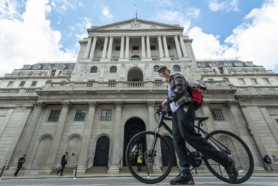 A woman walks past the Bank of England in London, Britain, on April 13, 2022. (Photo by Stephen Chung/Xinhua)