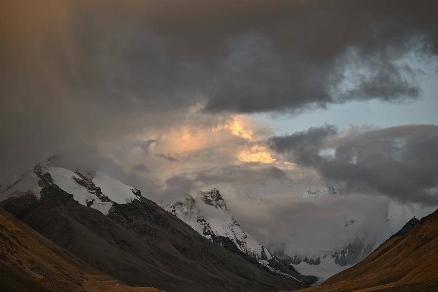 This photo taken on Sept. 4, 2024 from the Mount Qomolangma base camp in Dingri County of Xigaze City in southwest China's Xizang Autonomous Region shows a view of Mount Qomolangma at sunset. (Xinhua/Sun Ruibo)