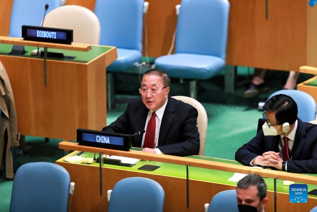 Zhang Jun (L), China's permanent representative to the United Nations, delivers a speech on behalf of 75 countries to the General Debate of the Third Committee of the UN General Assembly at the UN headquarters in New York, Oct. 1, 2021. China, representing 75 countries, on Friday called for global solidarity for vaccine equity at the General Debate of the Third Committee of the UN General Assembly. (Xinhua/Wang Ying)