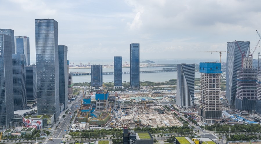 Aerial photo taken on Sept. 8, 2021 shows the construction site for a transaction center in Qianhai, Shenzhen City, south China's Guangdong Province. (Xinhua/Mao Siqian)