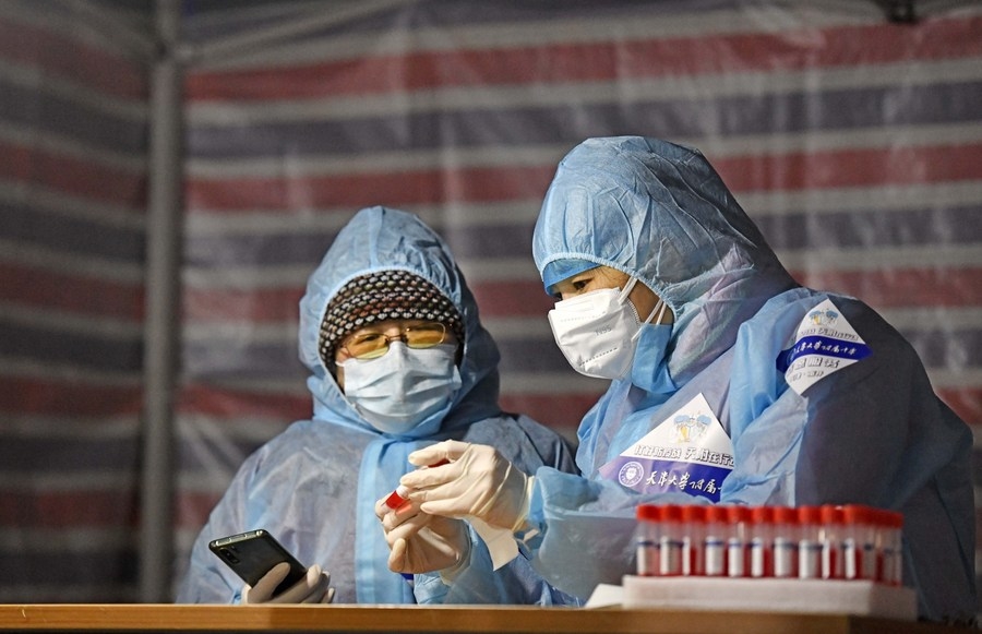 Staff members prepare medical materials for nucleic acid tests at a COVID-19 testing site in a residential community of Nankai District in north China's Tianjin, Jan. 20, 2022. (Xinhua/Zhao Zishuo)