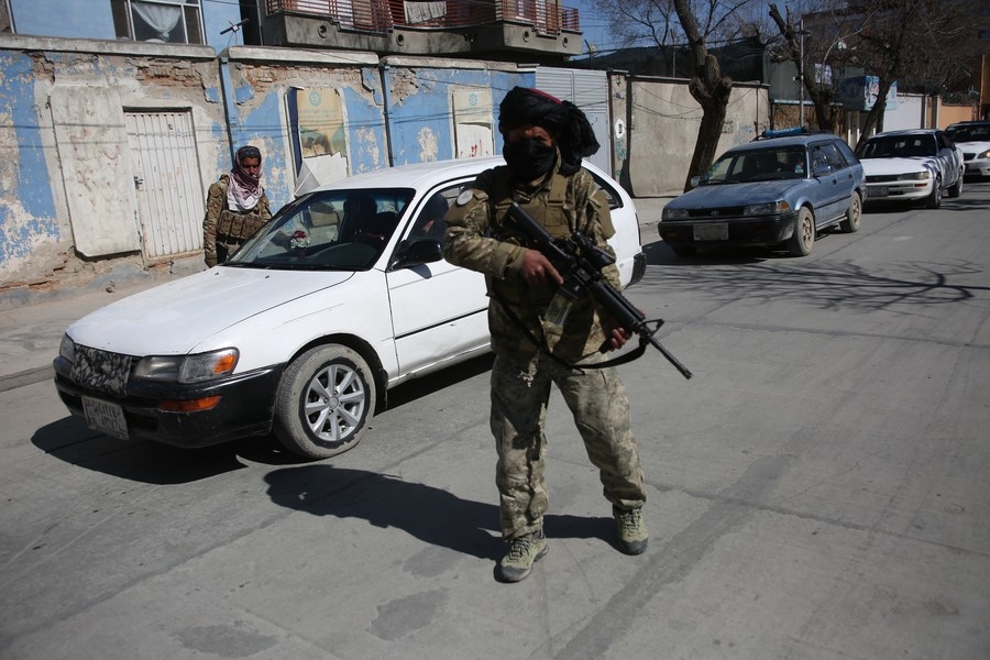 Afghan security force members stand at a security checkpoint during a clearance operation in Kabul, Afghanistan, Feb. 26, 2022. (Photo by Saifurahman Safi/Xinhua)