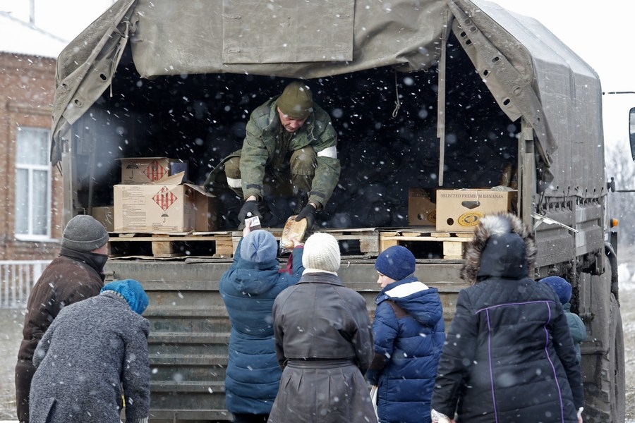 Local residents receive humanitarian aid in the village of Anadol in Donetsk, on March 10, 2022. (Photo by Victor/Xinhua)