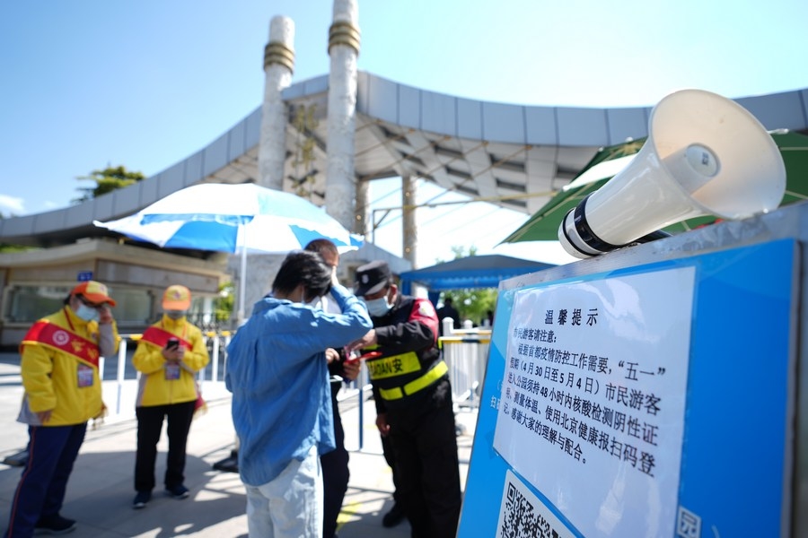 Staff members check tourists' negative results of nucleic acid tests taken within 48 hours at Qianmen street in Beijing, capital of China, April 30, 2022. (Xinhua/Ju Huanzong)
