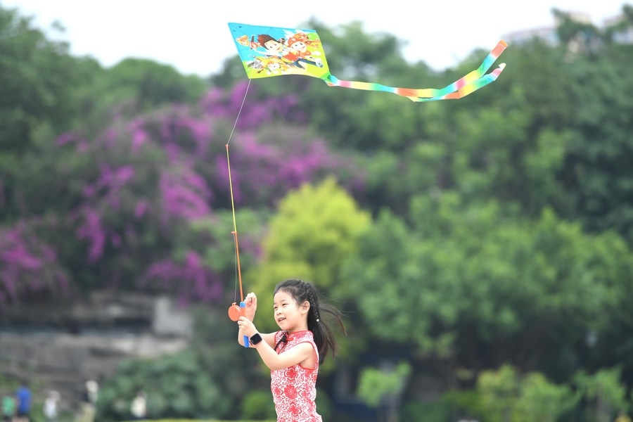 A girl flies a kite at Nanhu Park in Nanning, south China's Guangxi Zhuang Autonomous Region, April 30, 2022. (Xinhua/Zhou Hua)