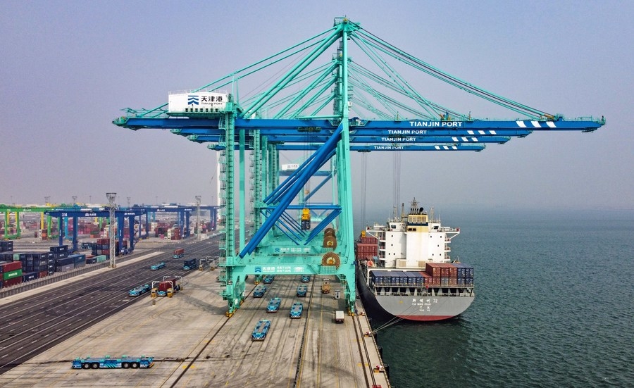 Aerial photo taken on April 9, 2022 shows a container ship by the Beijiang Port Area of Tianjin Port in north China's Tianjin.(Xinhua/Zhao Zishuo)