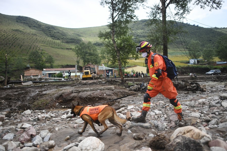 A rescuer carries out search and rescue work in Shadai Village, Qingshan Township of Datong Hui and Tu Autonomous County, northwest China's Qinghai Province, Aug. 18, 2022. (Xinhua/Zhang Hongxiang)
