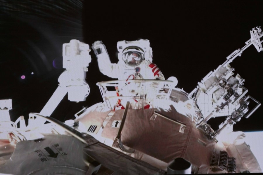 Screen image taken at Beijing Aerospace Control Center on Nov. 8, 2021 shows Chinese taikonaut Zhai Zhigang waving his hand after completing extravehicular activities. (Photo by Guo Zhongzheng/Xinhua)