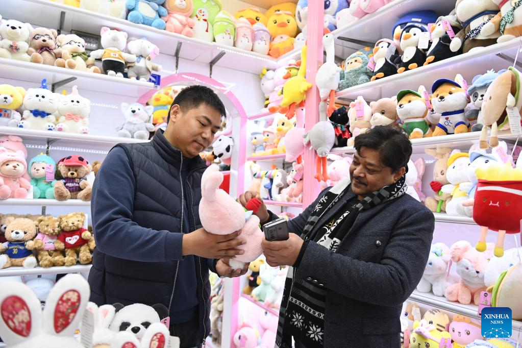 An Indian businessman (R) shops at the Yiwu International Trade Market in Yiwu City, east China's Zhejiang Province, Feb. 2, 2023. About 75,000 merchants at the Yiwu International Trade Market on Thursday welcomed their first business day in the Year of the Rabbit.(Xinhua/Huang Zongzhi)
