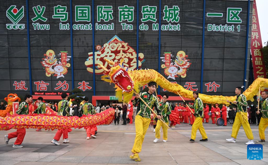People perform dragon dance during celebrations to welcome the first business day in the Year of the Rabbit at the International Trade Market in Yiwu City, east China's Zhejiang Province, Feb. 2, 2023. About 75,000 merchants at the Yiwu International Trade Market on Thursday welcomed their first business day in the Year of the Rabbit.(Xinhua/Huang Zongzhi)