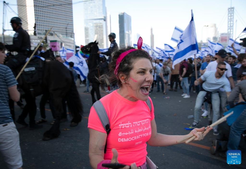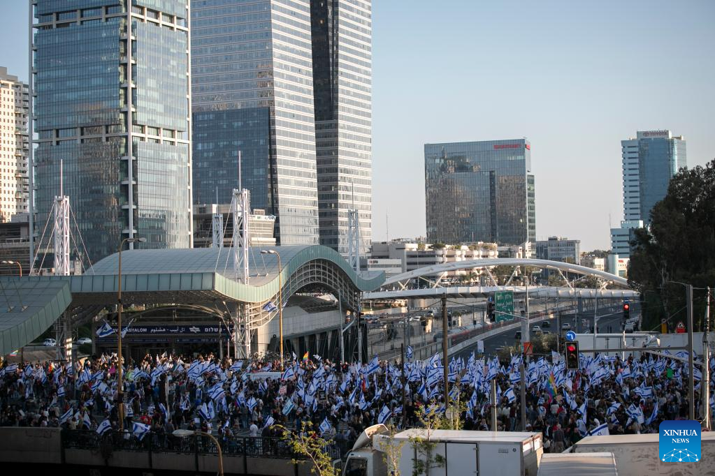 People protest against a judicial overhaul plan in Tel Aviv, Israel, on March 27, 2023. Israeli Prime Minister Benjamin Netanyahu announced on Monday evening that he would suspend the legislation of his contentious plan to overhaul the country's judiciary by about a month to allow "dialogue" between coalition and opposition lawmakers. He made the remarks in a televised speech, which came after tens of thousands of Israelis rallied outside the parliament on Monday and a general strike started earlier in the day to protest the overhaul. (Xinhua/Chen Junqing)