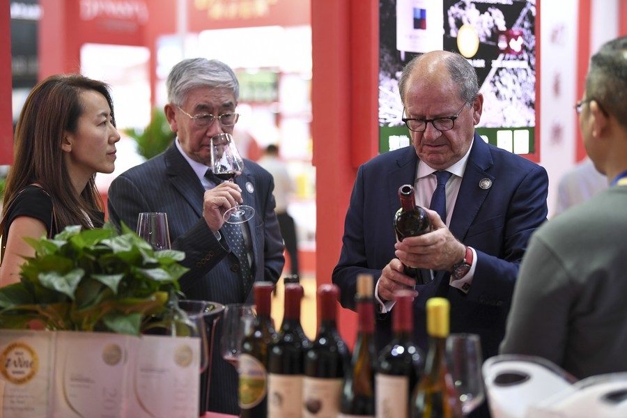 People taste wine during a wine-themed international conference and an expo in Yinchuan, northwest China's Ningxia Hui Autonomous Region, June 9, 2023. (Xinhua/Feng Kaihua)