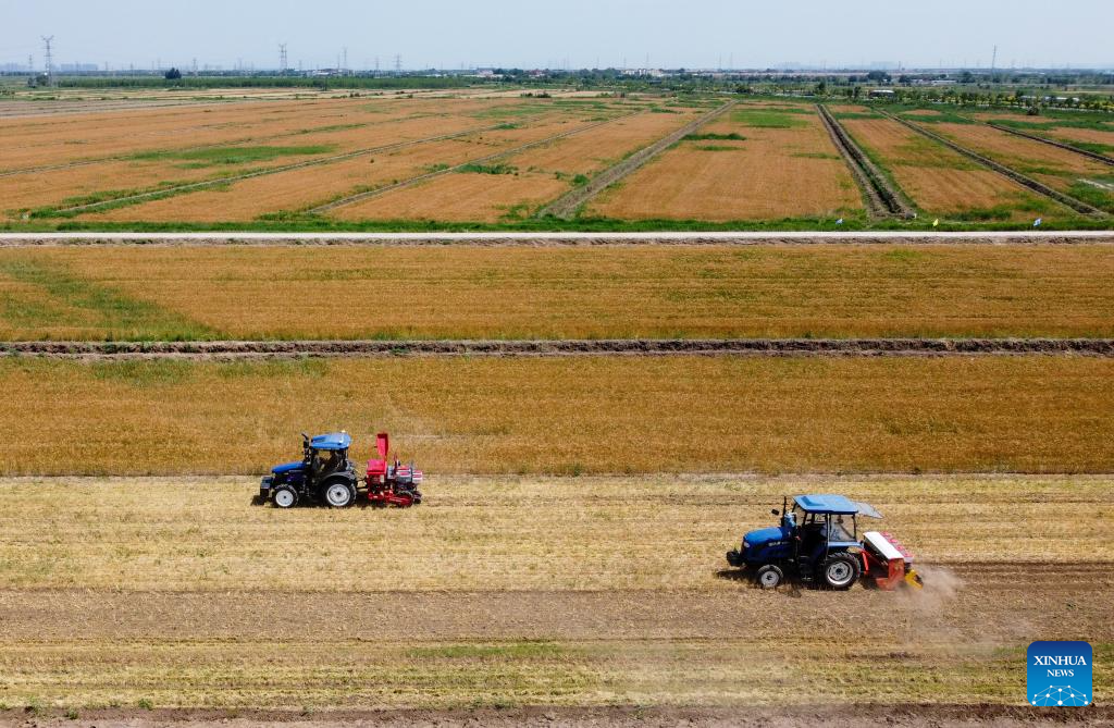 This aerial photo shows machines working during an activity organized by the local goverment to demonstrate agricultural machines in Caigongzhuang Township of Jinghai District, north China's Tianjin, June 11, 2023. Summer harvest in north China's Tianjin has begun. Modern agricultural technology and machinery have been applied in the region to help local farmers increase yield and attain a bumper harvest. (Xinhua/Sun Fanyue)