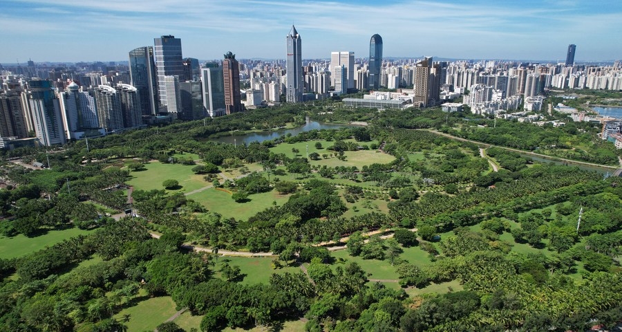This aerial photo taken on Aug. 9, 2023 shows the Evergreen Park in Haikou, south China's Hainan Province. (Xinhua/Yang Guanyu)