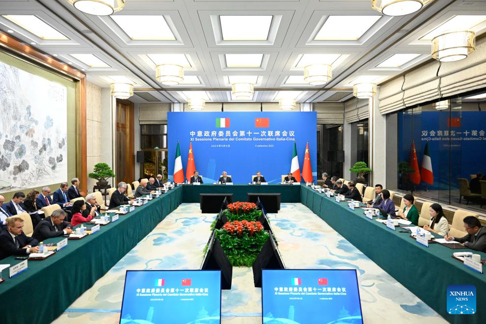 Chinese Foreign Minister Wang Yi, also a member of the Political Bureau of the Communist Party of China Central Committee, attends the 11th Joint Meeting of the China-Italy Government Committee with Italian Vice-President of the Council of Ministers and Minister of Foreign Affairs and International Cooperation Antonio Tajani in Beijing, capital of China, Sept. 4, 2023. (Xinhua/Shen Hong)