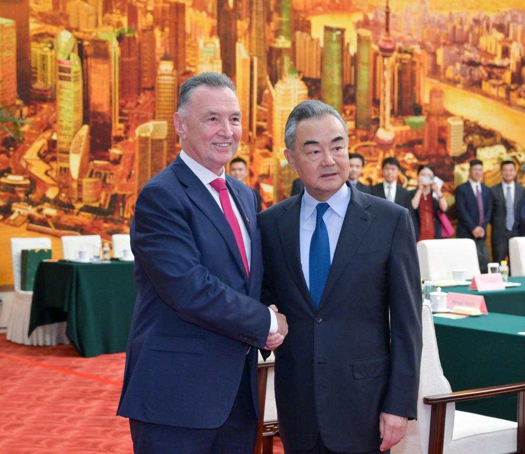 Chinese Foreign Minister Wang Yi, also a member of the Political Bureau of the Communist Party of China Central Committee, meets with Craig Emerson, head of an Australian delegation to the seventh session of the China-Australia High-Level Dialogue and former Australian Trade Minister, in Beijing, capital of China, Sept. 7, 2023. (Xinhua/Gao Jie)