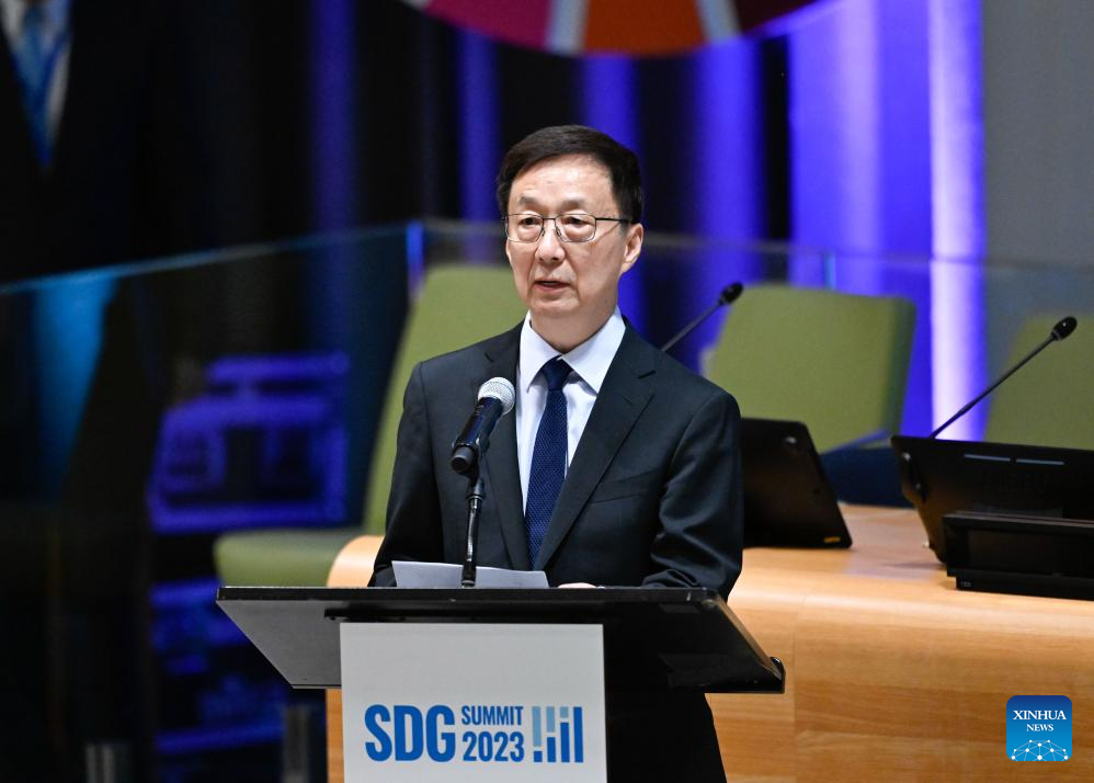Chinese Vice President Han Zheng addresses the SDG Summit held at the United Nations headquarters in New York, Sept. 19, 2023. (Xinhua/Shen Hong)
