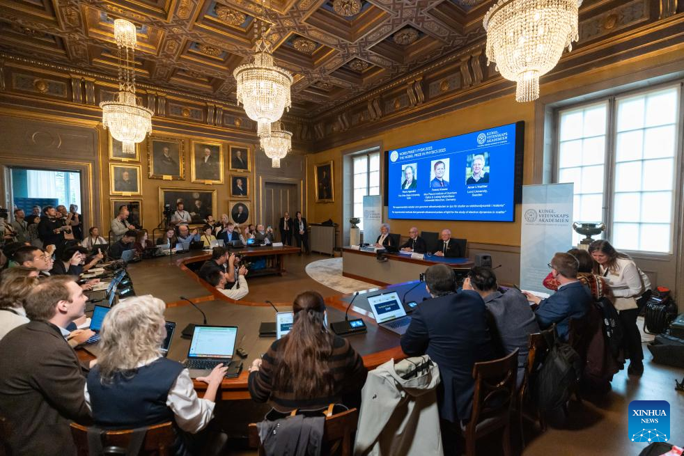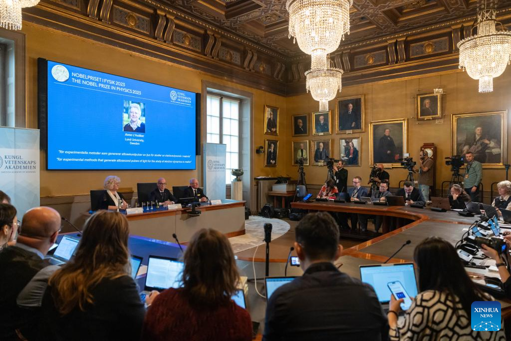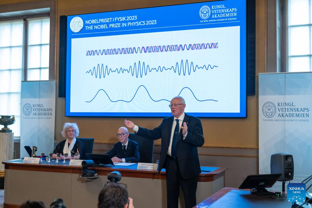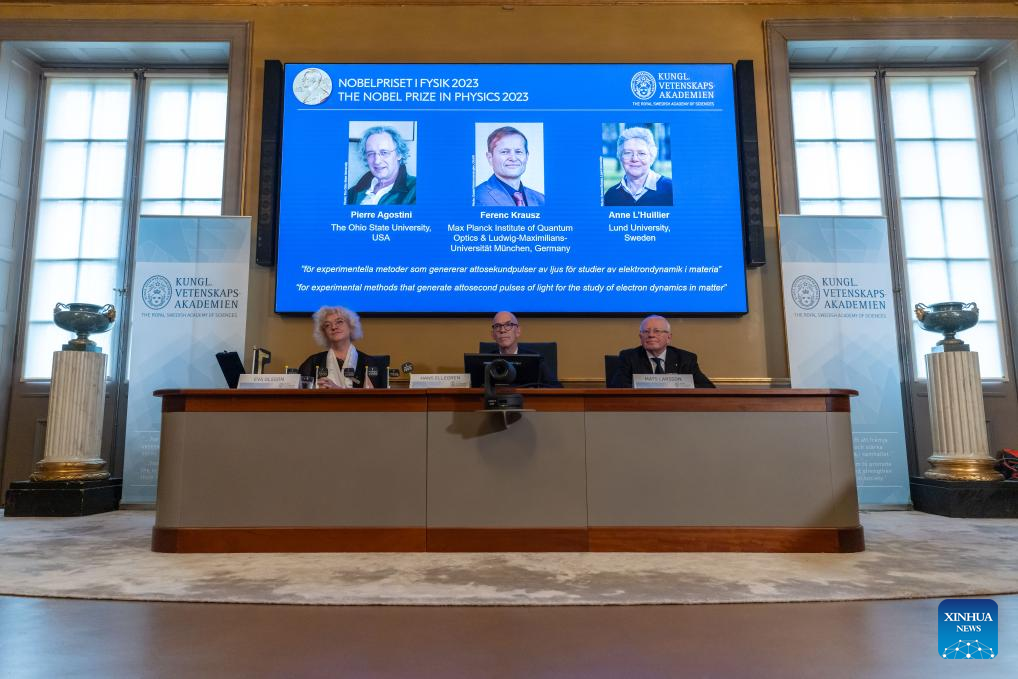 The announcement of the 2023 Nobel Prize in Physics is held at the Royal Swedish Academy of Sciences in Stockholm, Sweden, Oct. 3, 2023. Three scientists, Pierre Agostini, Ferenc Krausz and Anne L'Huillier, won the 2023 Nobel Prize in Physics "for experimental methods that generate attosecond pulses of light for the study of electron dynamics in matter," the Royal Swedish Academy of Sciences announced here Tuesday. (Photo by Wei Xuechao/Xinhua)