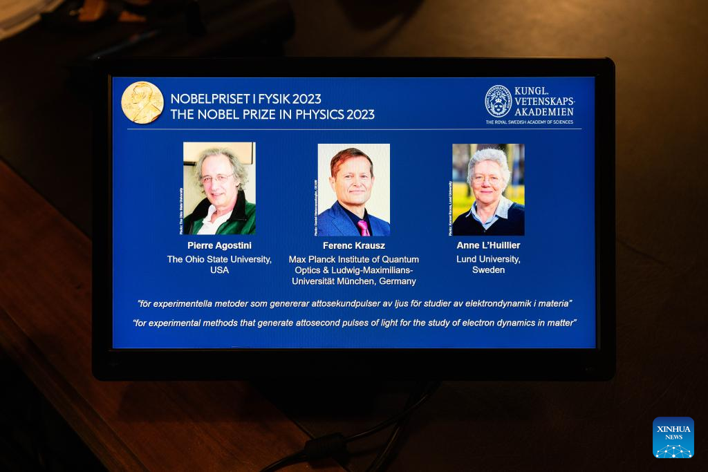 STOCKHOLM, Oct. 3 (Xinhua) -- Three scientists -- Pierre Agostini, Ferenc Krausz and Anne L'Huillier -- won the 2023 Nobel Prize in Physics for their work on "experimental methods that generate attosecond pulses of light for the study of electron dynamics in matter," the Royal Swedish Academy of Sciences announced here on Tuesday.