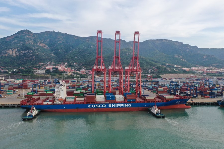 This aerial photo taken on May 9, 2023 shows a port in Lianyungang, east China's Jiangsu Province. In 2013, China proposed the idea of building an "economic belt along the Silk Road" in Kazakhstan, which, combined with the proposal of the 21st Century Maritime Silk Road, eventually became the Belt and Road Initiative (BRI).(Xinhua/Ji Chunpeng)