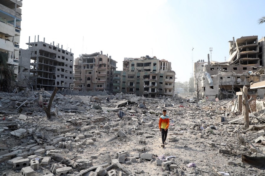 This photo taken on Oct. 10, 2023 shows destroyed buildings following an Israeli airstrike in Gaza City. (Photo by Rizek Abdeljawad/Xinhua)