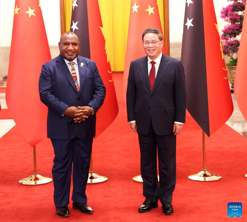 BEIJING, Oct. 16 (Xinhua) -- Chinese Premier Li Qiang on Monday held talks with Prime Minister of Papua New Guinea James Marape, who is in Beijing to attend the third Belt and Road Forum for International Cooperation and pay an official visit to China.