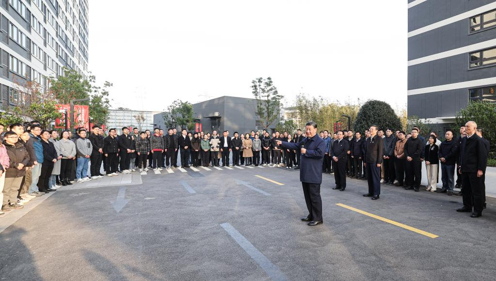 Chinese President Xi Jinping, also general secretary of the Communist Party of China (CPC) Central Committee and chairman of the Central Military Commission, inspects a government-subsidized rental housing community in east China's Shanghai, Nov. 29, 2023. Xi made an inspection tour in east China's Shanghai from Tuesday to Wednesday. During his trip, Xi inspected the Shanghai Futures Exchange, an exhibition on Shanghai's sci-tech innovations, and a government-subsidized rental housing community, learning about the city's efforts in strengthening its competitiveness as an international financial center, building the city into an international sci-tech innovation center, and constructing government-subsidized rental housing projects. (Xinhua/Xie Huanchi)