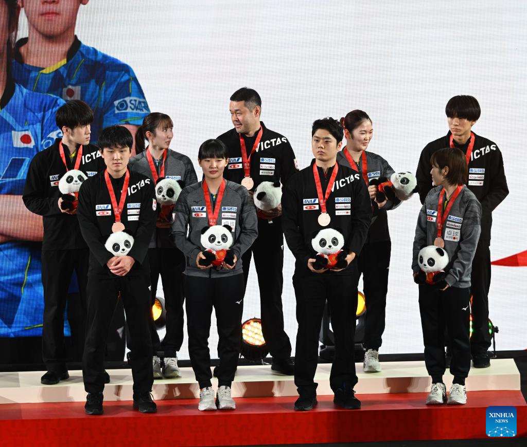 Third placed team Japan attend the awarding ceremony of the ITTF Mixed Team World Cup 2023 in Chengdu, southwest China's Sichuan Province, Dec. 10, 2023. (Xinhua/Wang Xi)