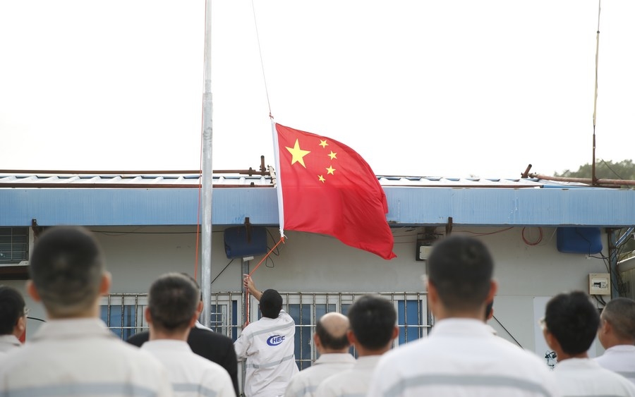 A Chinese diplomatic team responsible for reestablishing the Chinese embassy in Nauru holds a Chinese national flag-raising ceremony in the Republic of Nauru, Jan. 29, 2024. (Photo by Chen Guolong/Xinhua)
