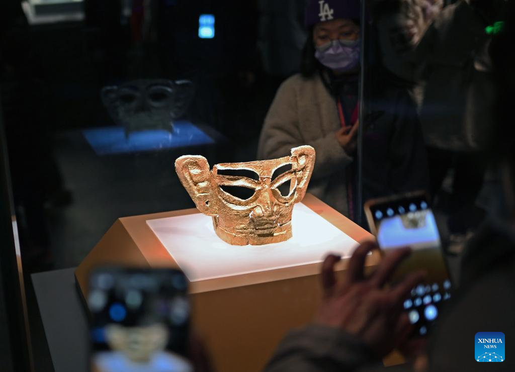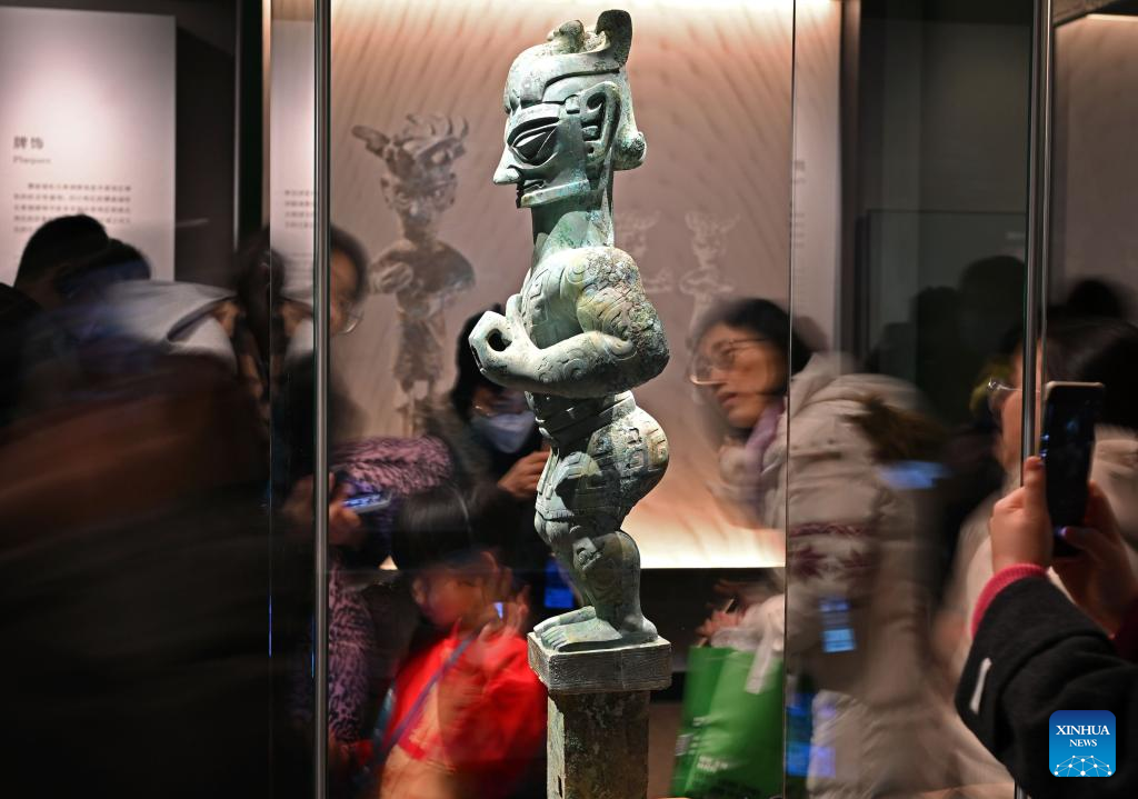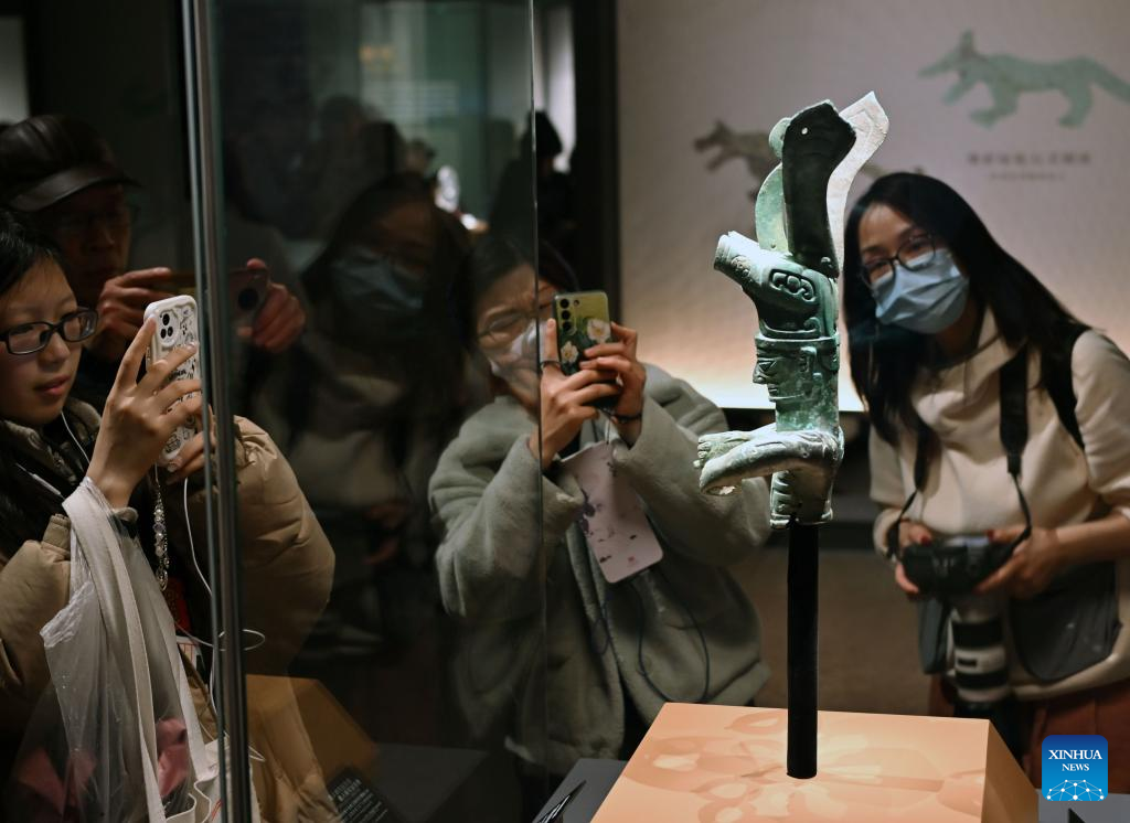 Visitors take photos of an exhibit during the exhibition of "Stars over China: The Ancient Shu Civilization of Sanxingdui and Jinsha" in Shanghai Museum, Shanghai, east China, Feb. 15, 2024. (Xinhua/Liu Ying)