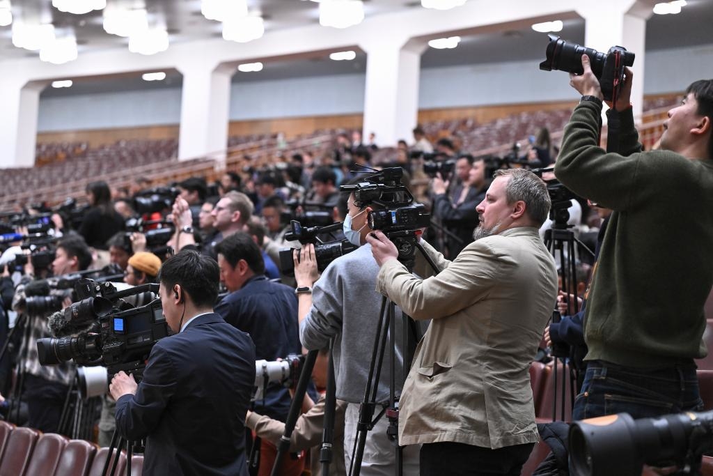 Journalists work at the opening meeting of the second session of the 14th National Committee of the Chinese People's Political Consultative Conference (CPPCC) at the Great Hall of the People in Beijing, capital of China, March 4, 2024. (Xinhua/Yan Yan)