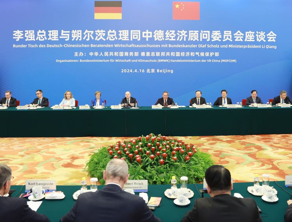 Chinese Premier Li Qiang and Federal Chancellor of Germany Olaf Scholz jointly attend a meeting of the China-Germany economic advisory committee at the Great Hall of the People in Beijing, capital of China, April 16, 2024. (Xinhua/Yin Bogu)