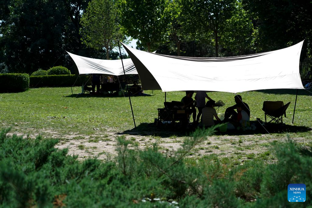 People stay under a canopy to shield themselves from the sun at Chaoyang Park in Beijing, capital of China, June 9, 2024. (Xinhua/Chen Zhonghao)