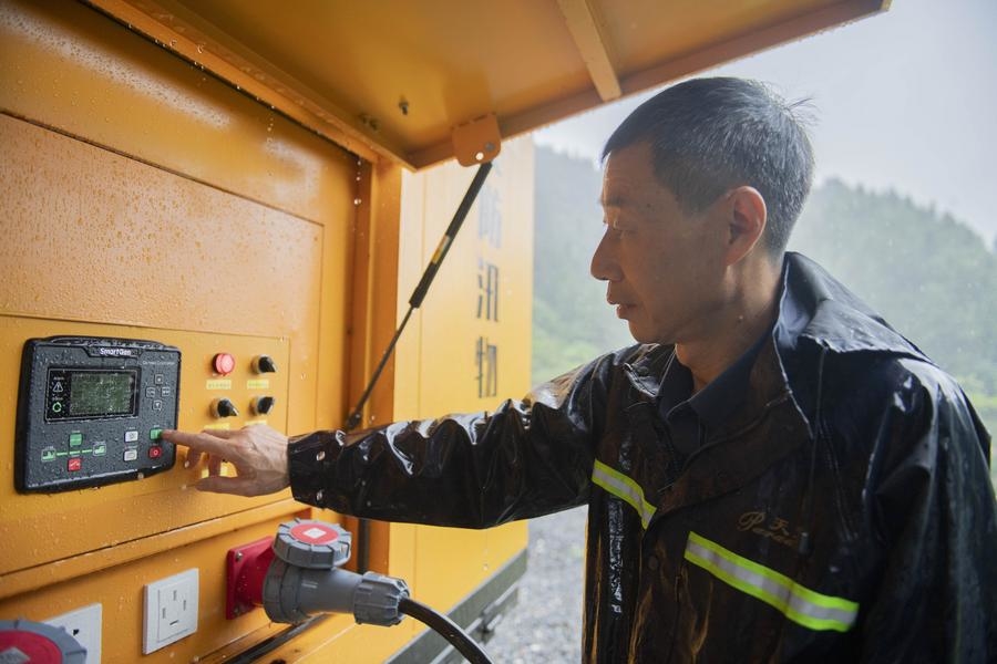 Inspector Zhang Jinliang operates a drainage pump station in Tunguang Township of Tunxi District, Huangshan City, east China's Anhui Province, June 26, 2024. (Xinhua/Fu Tian)