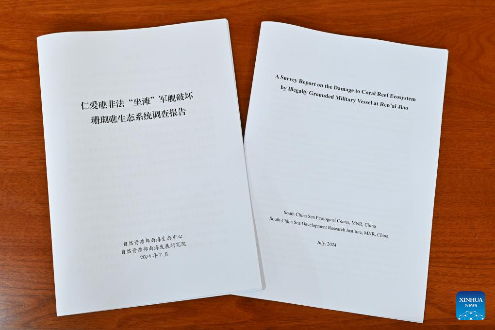 This photo taken on July 8, 2024 shows copies of the Chinese and English versions of A Survey Report on the Damage to Coral Reef Ecosystem by Illegally Grounded Military Vessel at Ren'ai Jiao during its releasing ceremony in Beijing, capital of China. (Xinhua/Li Xin)
